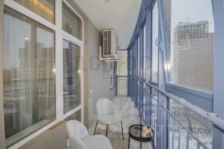 И гостиная, и спальня, и прихожая местами декорированы панорамными зеркалами, что придает помещениям объем и шарм. Гостиная и спальня оборудованы системой кондиционирования. Блок вынесен на лоджию с панорамным остеклением. Отсюда, как и из окон гостиной, открывается умопомрачительный вид на город Екатеринбург.