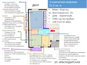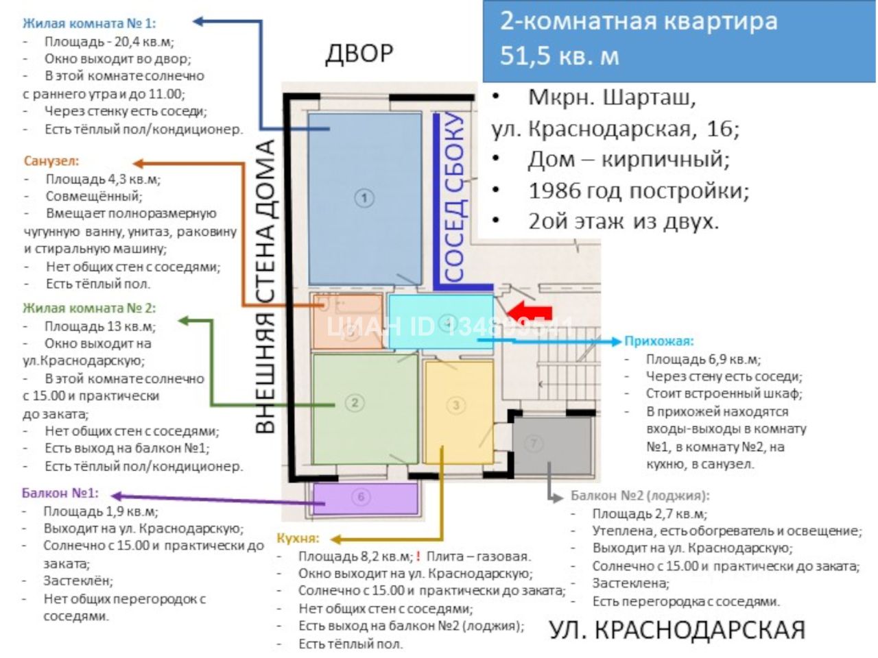 Балкон 1 (1,9 кв.м) выходит на ул. Краснодарскую. На него выход из комнаты 2. Застеклён пластиковыми раздвижными ставнями, не утеплён. Солнечно с 15.00 и до позднего вечера.