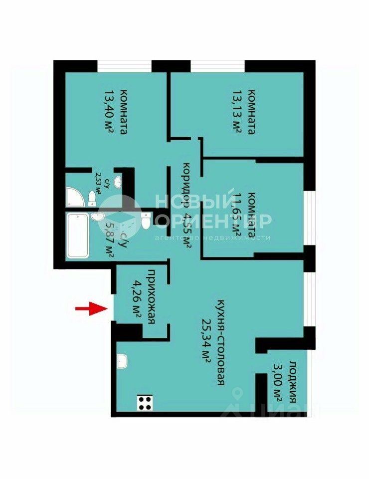 Общая площадь квартиры 80,3 кв м, кухня-гостиная 25,34 кв м., три отдельные комнаты.