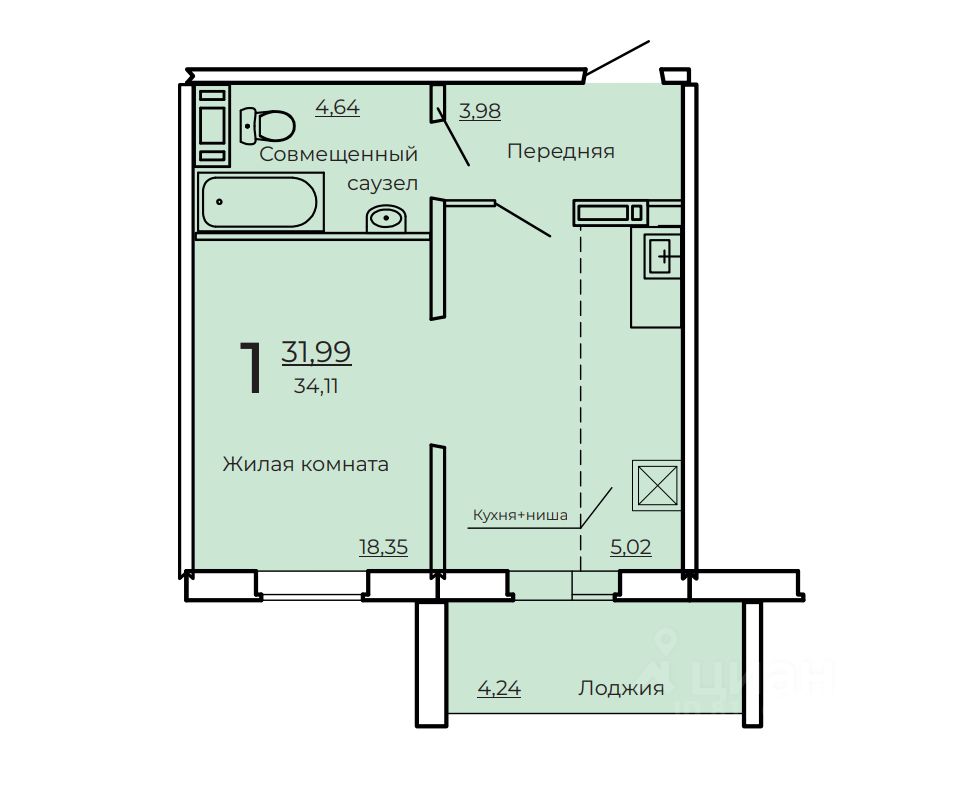 Площадь 34,11 м² свобода планировки под ваш стиль жизни