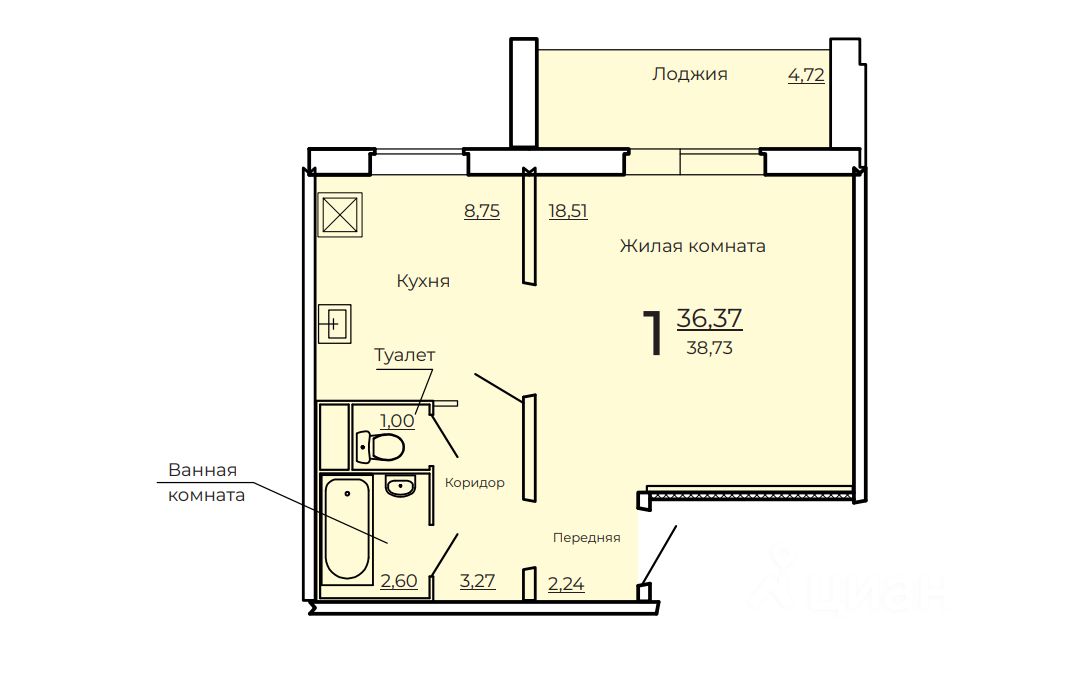 Площадь 38,73 м² свобода планировки под ваш стиль жизни