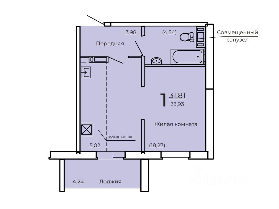 Площадь 33,93 м² свобода планировки под ваш стиль жизни