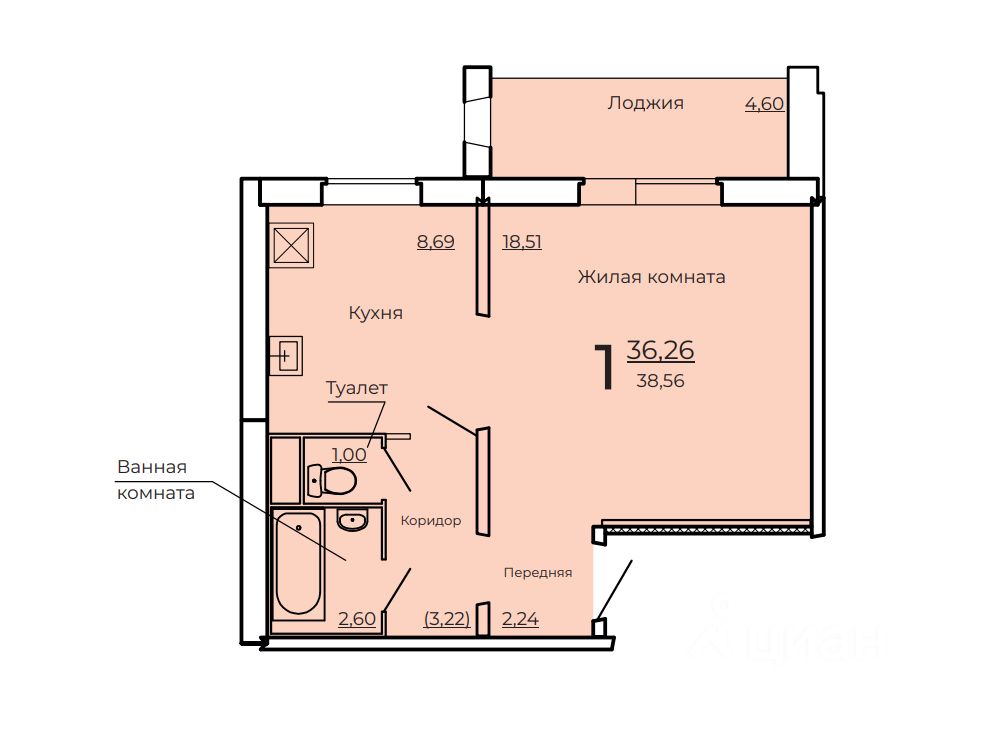 Площадь 38,56 м² свобода планировки под ваш стиль жизни