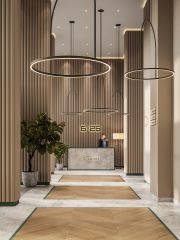 Дизайнерские холлы. Парадный холл с остеклением в пол, зонами ожидания, гостевым санузлом и санузлом для мытья лап животным, а также колес велосипедов и колясок.
