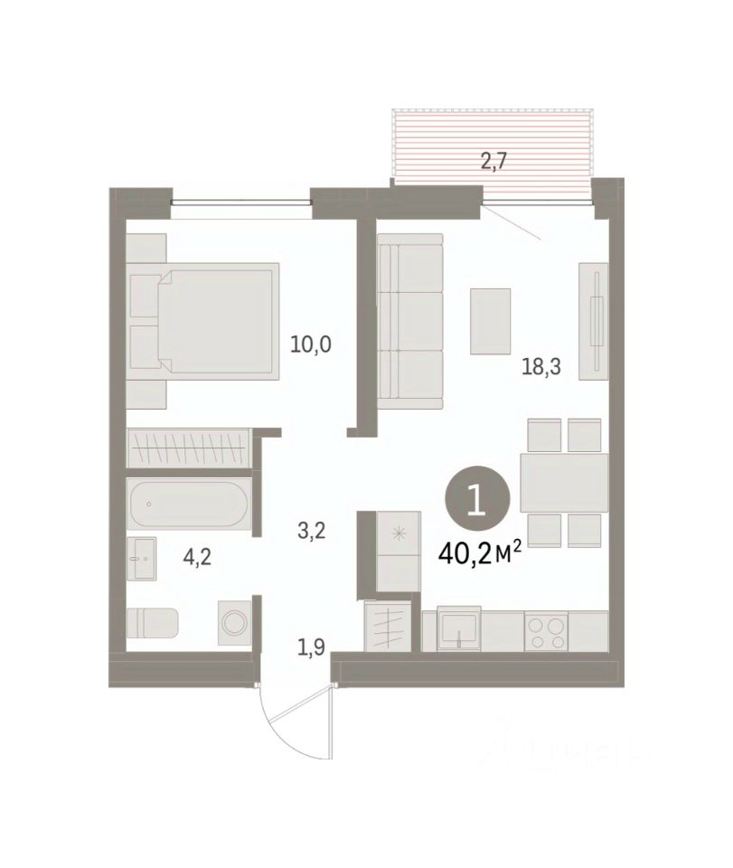 Квартира с кухней-гостиной и одной спальней в районе Шишимская горка. Особенности планировки: предчистовая отделка, балкон.
