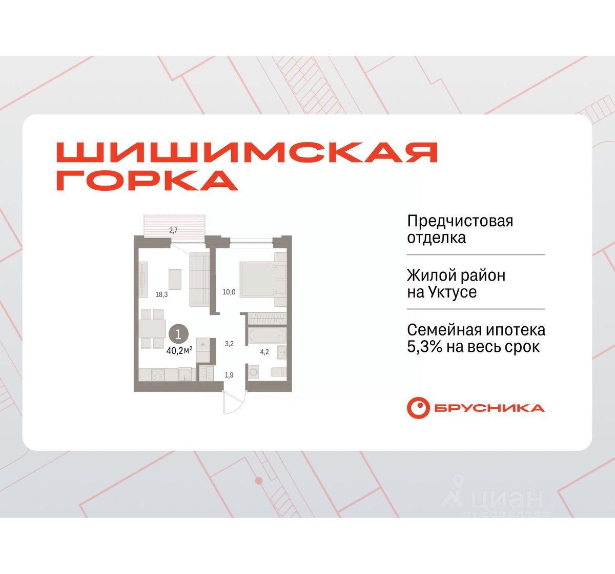 Квартира с кухней-гостиной и одной спальней в районе Шишимская горка. Особенности планировки: предчистовая отделка, балкон.