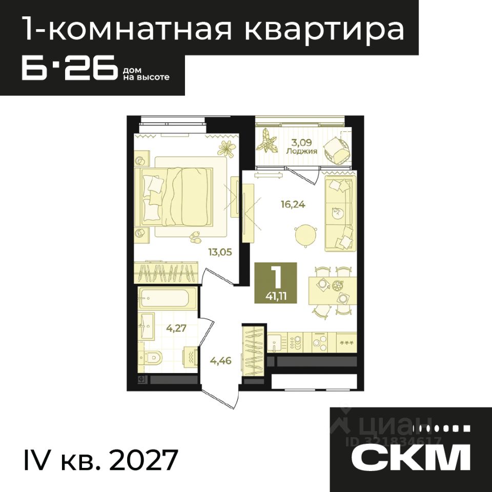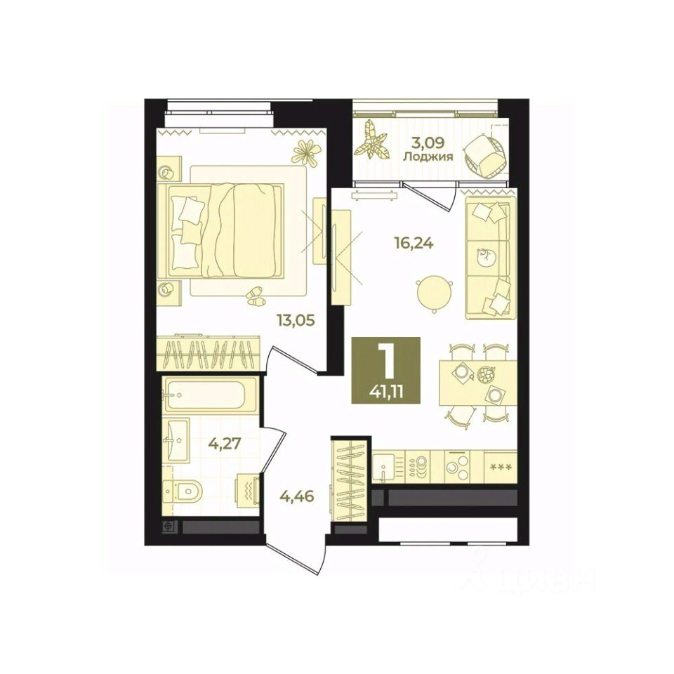 Общая площадь41,11 м²