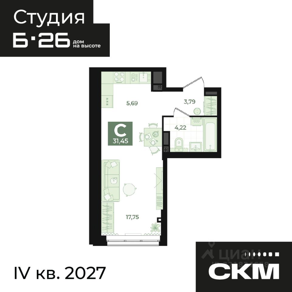 Общая площадь31,45 м²