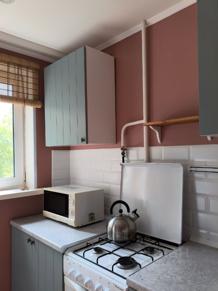 В квартире сделана законная перепланировка, за счет чего кухня и ванная стали более удобными и просторными. Стены окрашены влагостойкой краской, на полу уложен ламинат в один слой без стыков, потолки на кухне и в коридоре - гипсокартон с точечным светом, ванной уложена плитка.