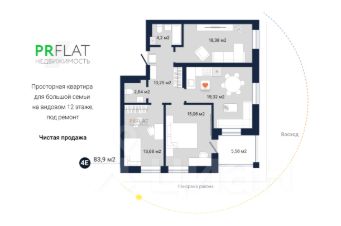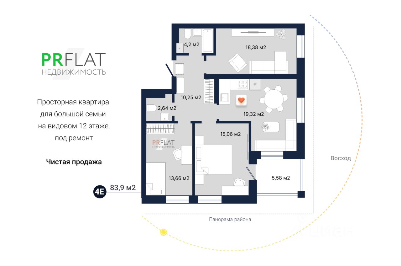 Квартира общей площадью 83,9 кв. м: просторная кухня-столовая - 19,3 кв. м, гостиная - 18,4 кв. м, две уютных спальни - 13,7 кв. м и 15 кв. м, большой коридор с прихожей - 10,25 кв. м, совмещенный санузел - 4,2 кв. м, гостевой санузел - 2,6 кв. м, который легко переоборудовать под гардероб. Высота потолков - 2,7 м. Из большой спальни - выход на панорамную лоджию.