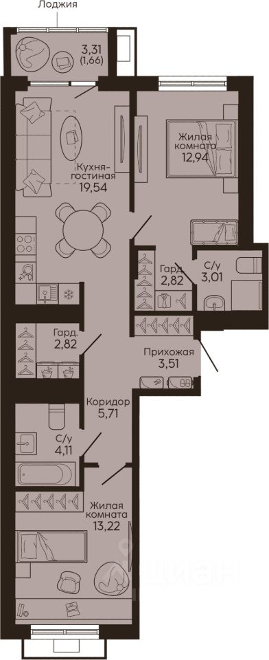 Общая площадь69,34 м²