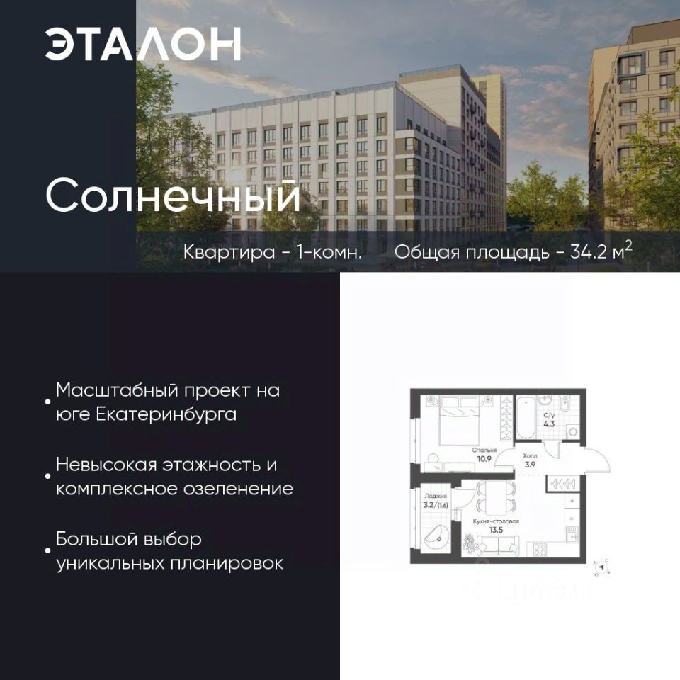 Продается квартира 307, по адресу Свердловская обл., г. Екатеринбург, Чкаловский район, корпус Солнечный, блок 6.3 в Солнечный на 6 этаже, с площадью 34.2 м2.