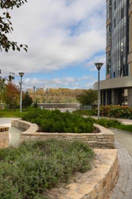 Закрытый двор на стилобате представляет собой современное "безгрязевое" ландшафтное пространство с трёхуровневым озеленением, зон отдыха и спорта, без автомобилей.