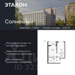 Продается квартира 205, по адресу Свердловская обл., г. Екатеринбург, Чкаловский район, корпус Солнечный, корпус 6.2 в Солнечный на 10 этаже, с площадью 45.01 м2.