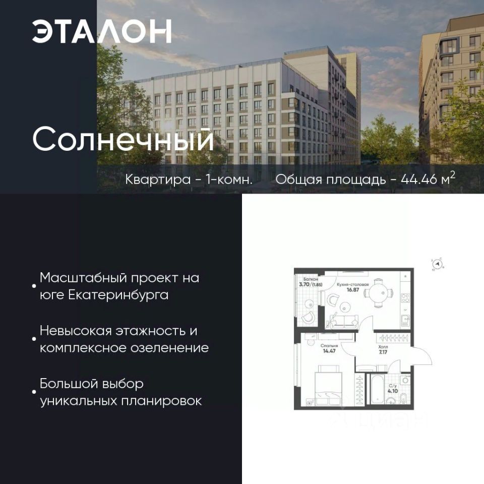 Продается квартира 120, по адресу Свердловская обл., г. Екатеринбург, Чкаловский район, корпус Солнечный, корпус 6.2 в Солнечный на 14 этаже, с площадью 44.46 м2.