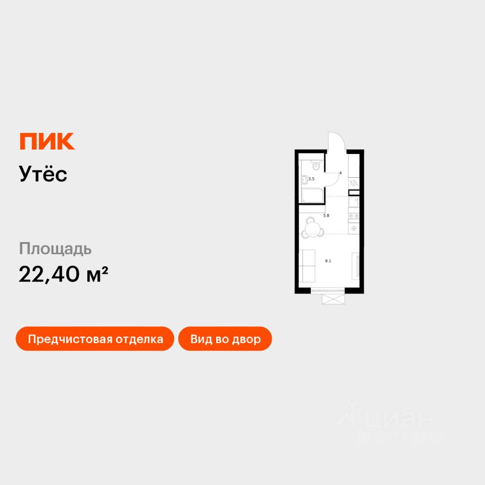 Продаётся квартира-студия площадью 22,4 кв.м на 25 этаже 29 этажного дома (Корпус 6, Секция 1) проекта ПИК Утёс. Светлый просторный подъезд на уровне земли, функциональная планировка, большие окна, предчистовая отделка.