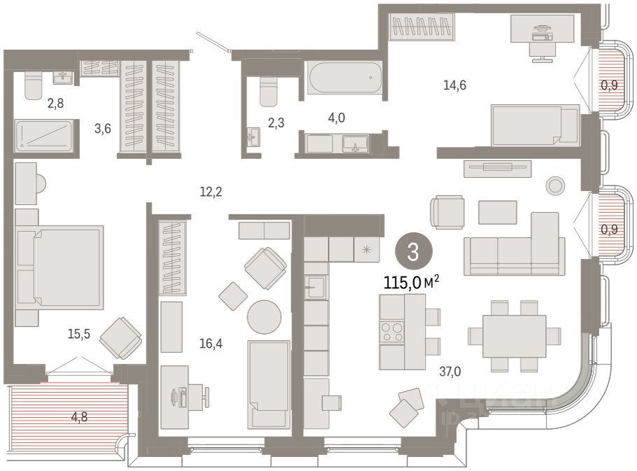 Квартира с кухней-гостиной и тремя спальнями в квартале "На Некрасова". Особенности планировки: второй санузел, лоджия, разнесённые спальни, предчистовая отделка, мастер-спальня, балкон.