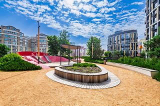 -безопасный двор без машин с ландшафтным дизайном европейского уровня, оборудован детскими и спортивными площадками, и зонами отдыха