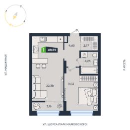 Продаётся 1-комнатная квартира в строящемся доме (Дом 8 (17А-17В)), срок сдачи: IV-кв. 2026, общей площадью 49.89 кв.м., на 5 этаже. В жилом квартале есть собственный выход в ЦПКиО им. Маяковского для утренних пробежек и отдыха всей семьёй.