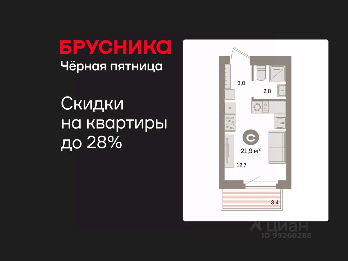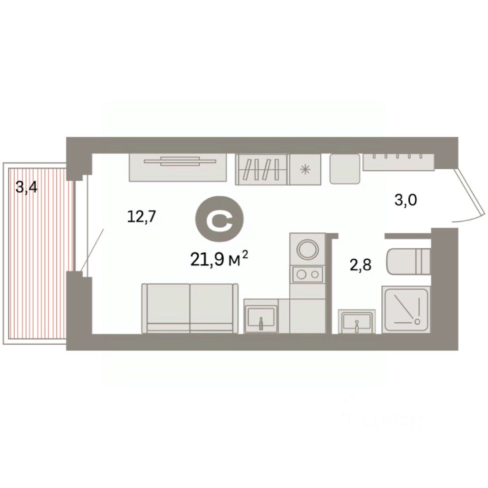 Студия в квартале "Депо". Особенности планировки: предчистовая отделка, балкон.