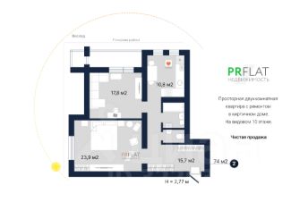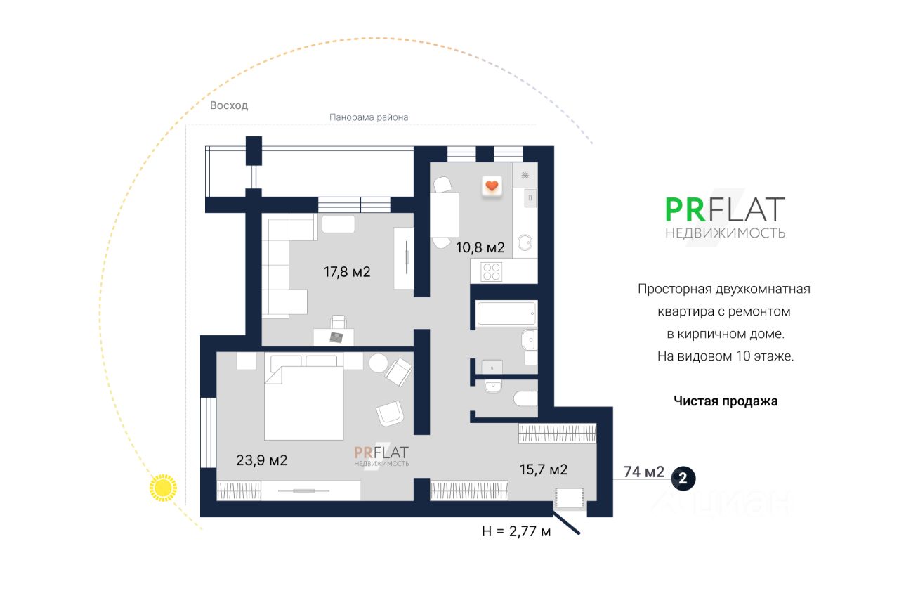 Квартира общей площадью 74 кв. м: удобная кухня - 10,8 кв. м, гостиная - 17,8 кв. м с выходом на балкон, большая спальня - 23,9 кв. м, просторный коридор с прихожей - 15,7 кв. м, санузел раздельный. Высота потолков - 2,77 м.