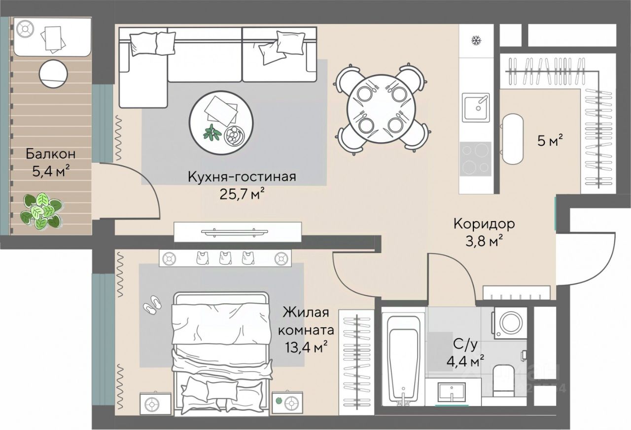 Продаётся 1-комнатная квартира в строящемся доме (Секции 1.4-1.6 (2 очередь)), срок сдачи: IV-кв. 2026, общей площадью 53.9 кв.м., на 5 этаже.