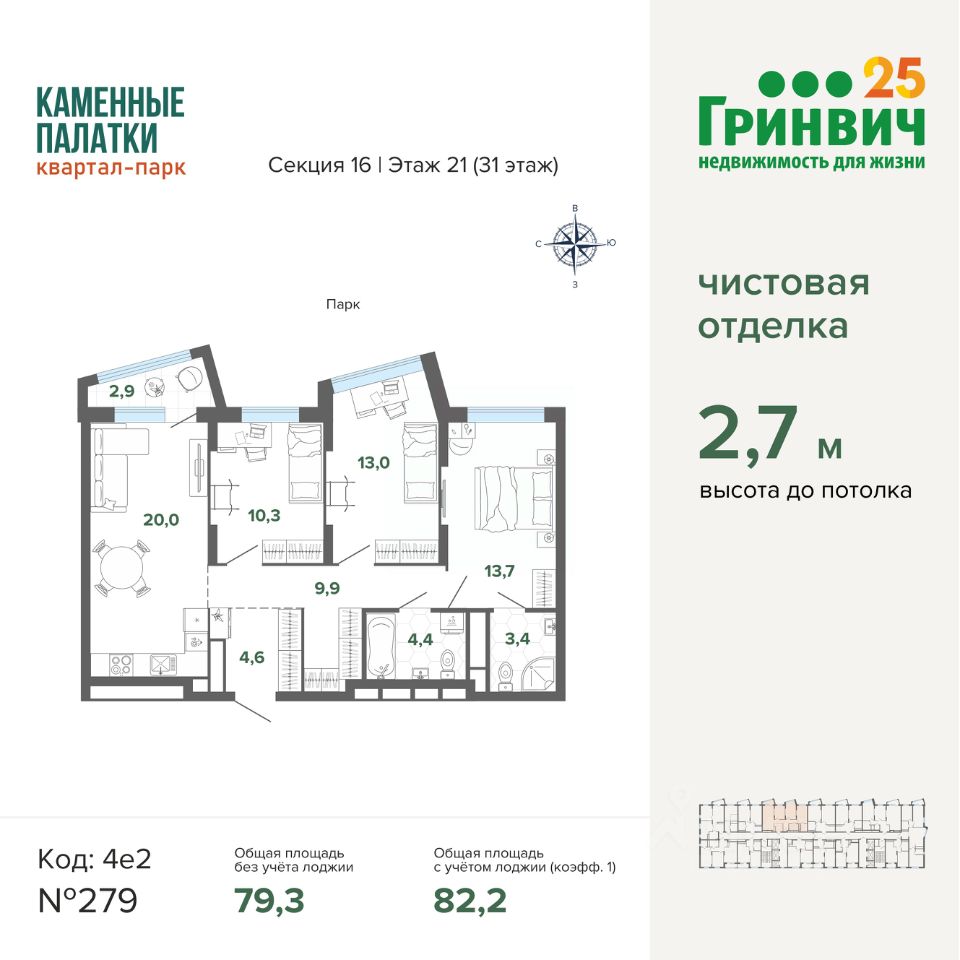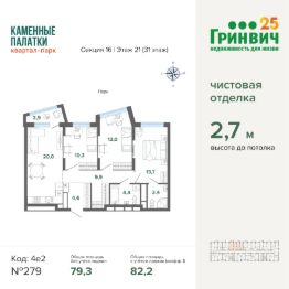 • Высокие потолки (2,7 м);