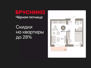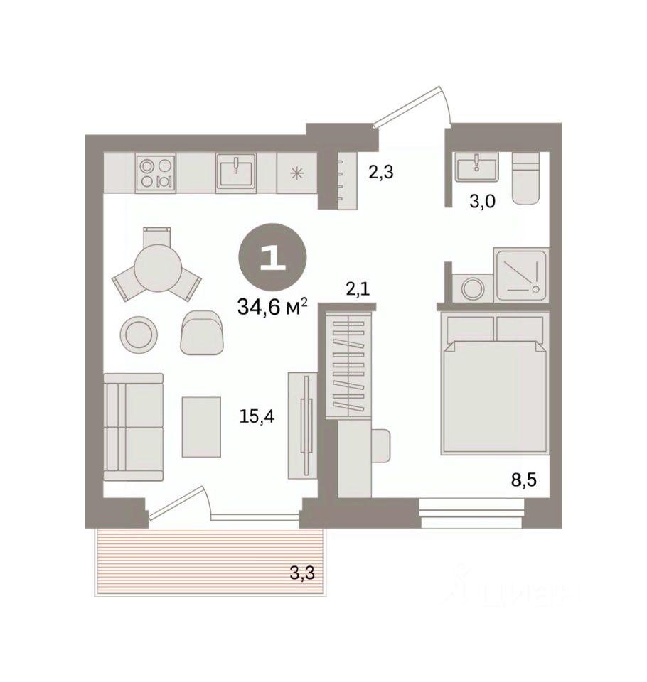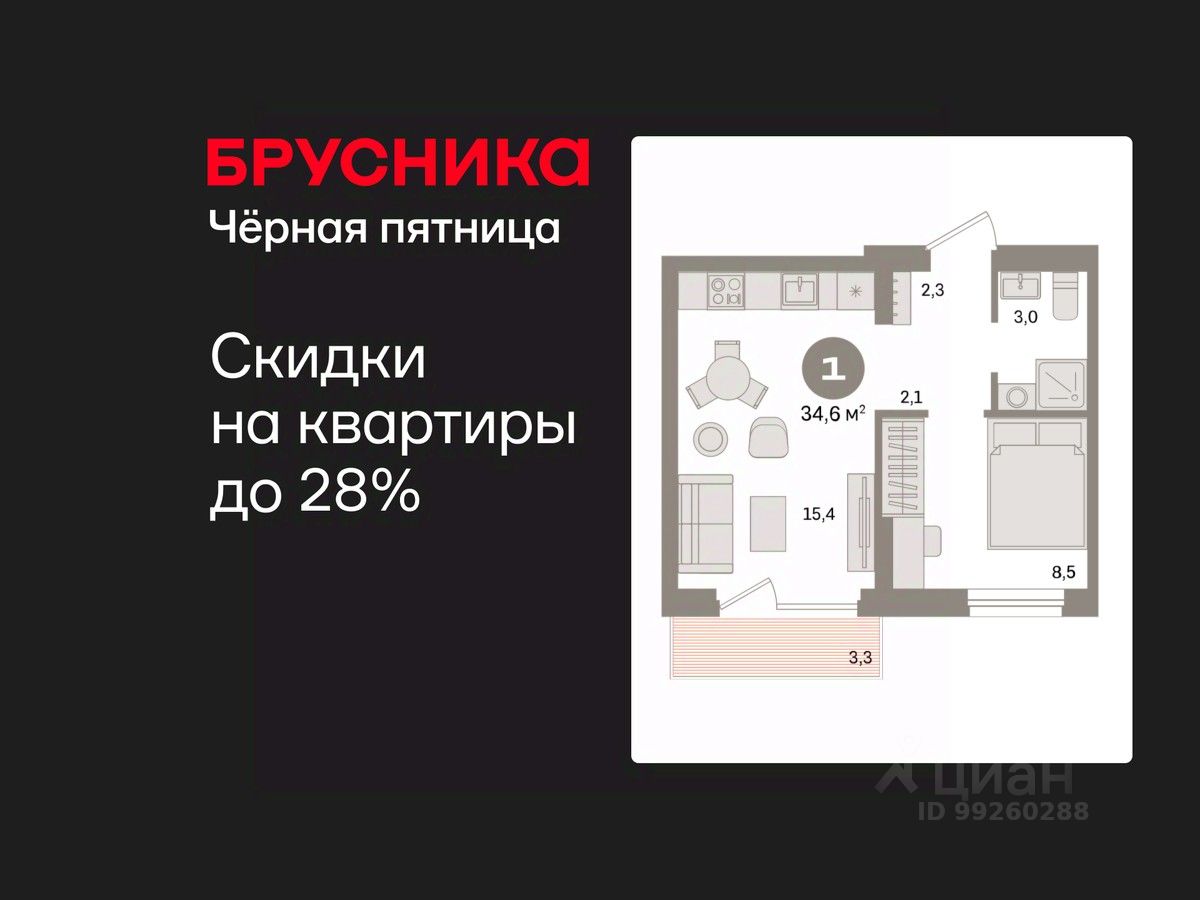 Квартира с кухней-гостиной и одной спальней в квартале "Депо". Особенности планировки: вид во двор, предчистовая отделка, балкон.