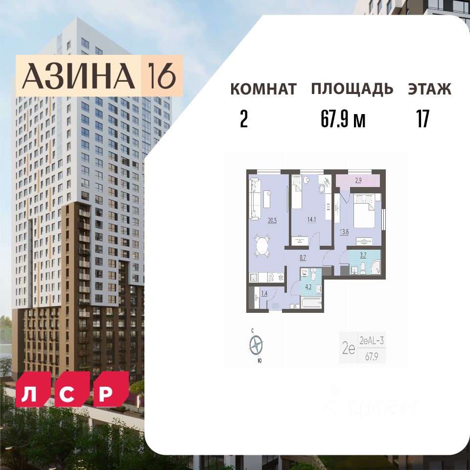 Квартира располагается на 17 этаже 25-этажного дома в ЖК Азина, 16.