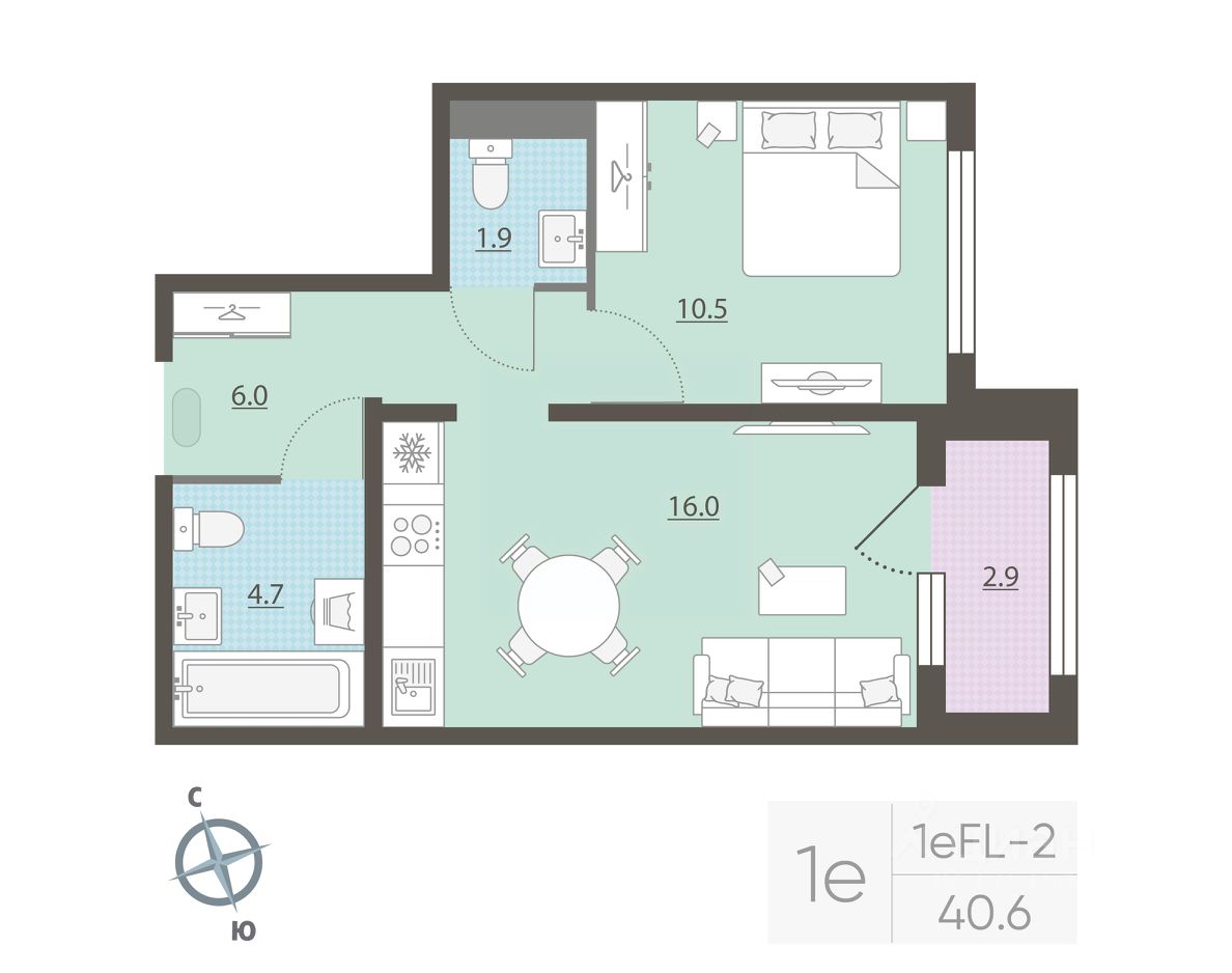 Жилая площадь 10.5 м2, кухня 16 м2, отделка под ключ. Раздельных санузлов - нет, балконов - нет, лоджий - 1.