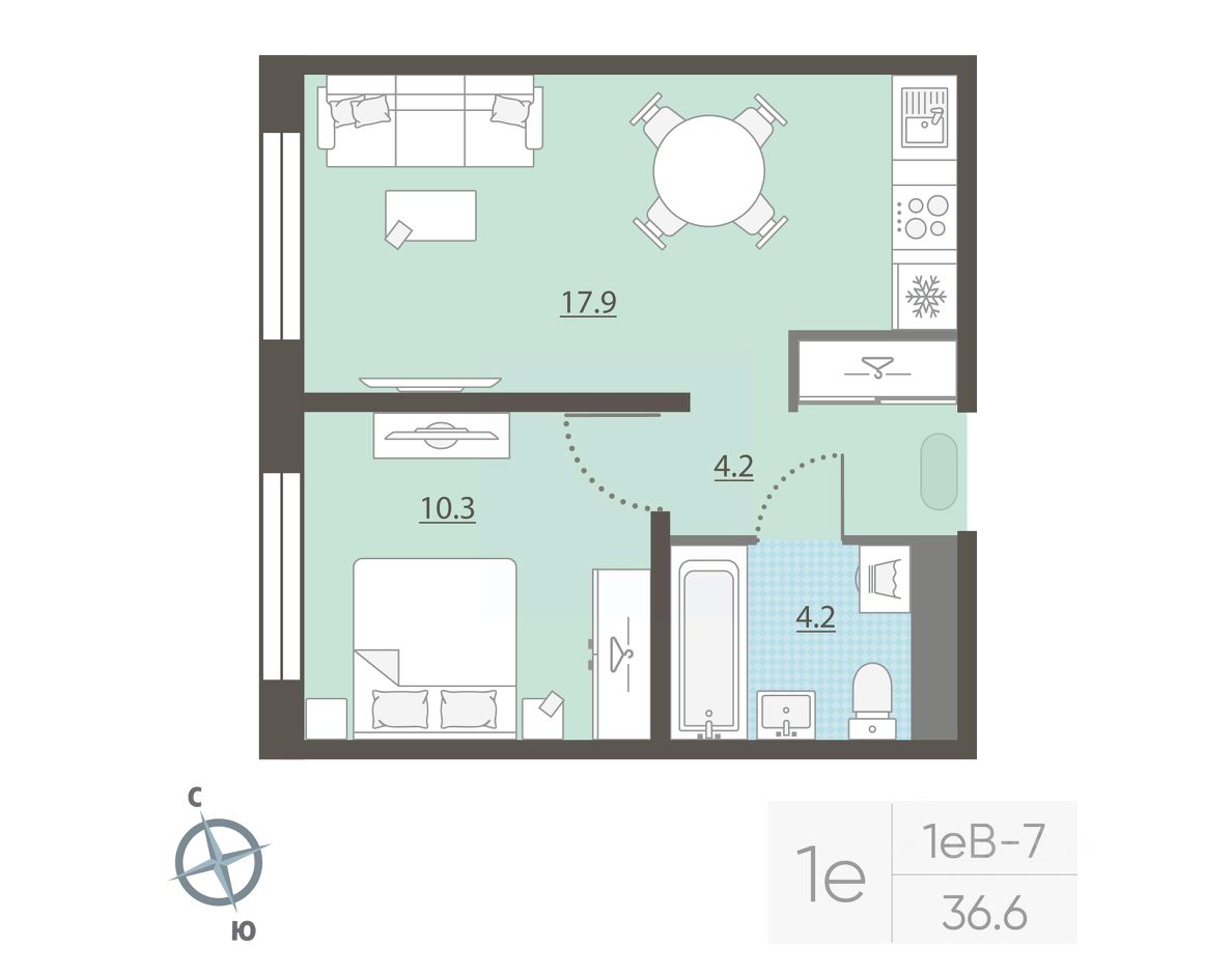 Жилая площадь 10.3 м2, кухня 17.9 м2, отделка под ключ. Раздельных санузлов - нет, балконов - нет, лоджий - нет.