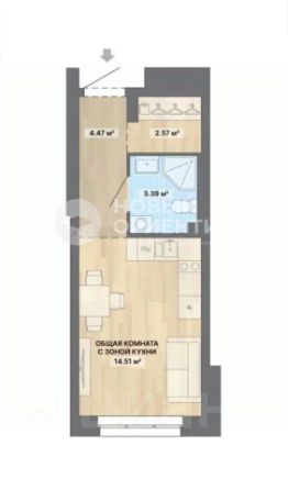 Очень грамотная планировка для студии: Кухня-столовая 14,5 м2. Холл 4,5 м2, гардеробная 2,6 м2 и совмещенная ванная 3,4 м2.