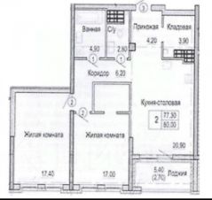 Просторная двухкомнатная квартира с кухней-гостиной евротрешка, площадью 77,3 кв.м.