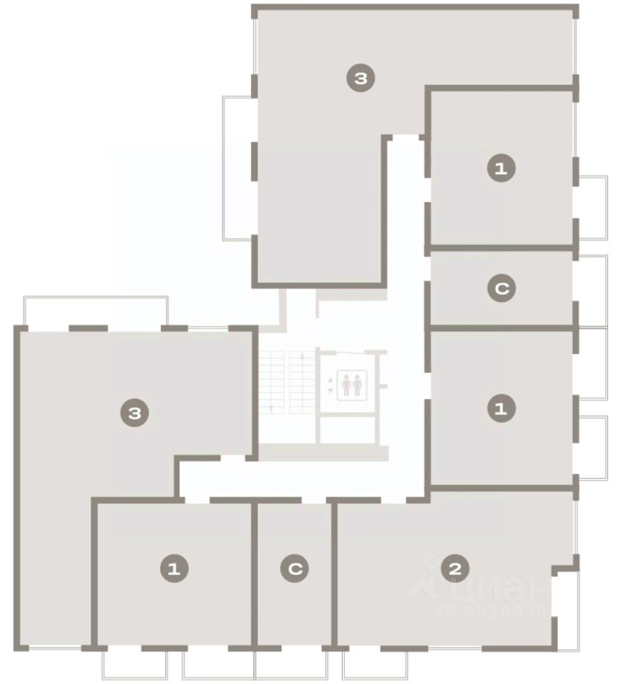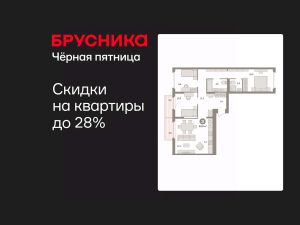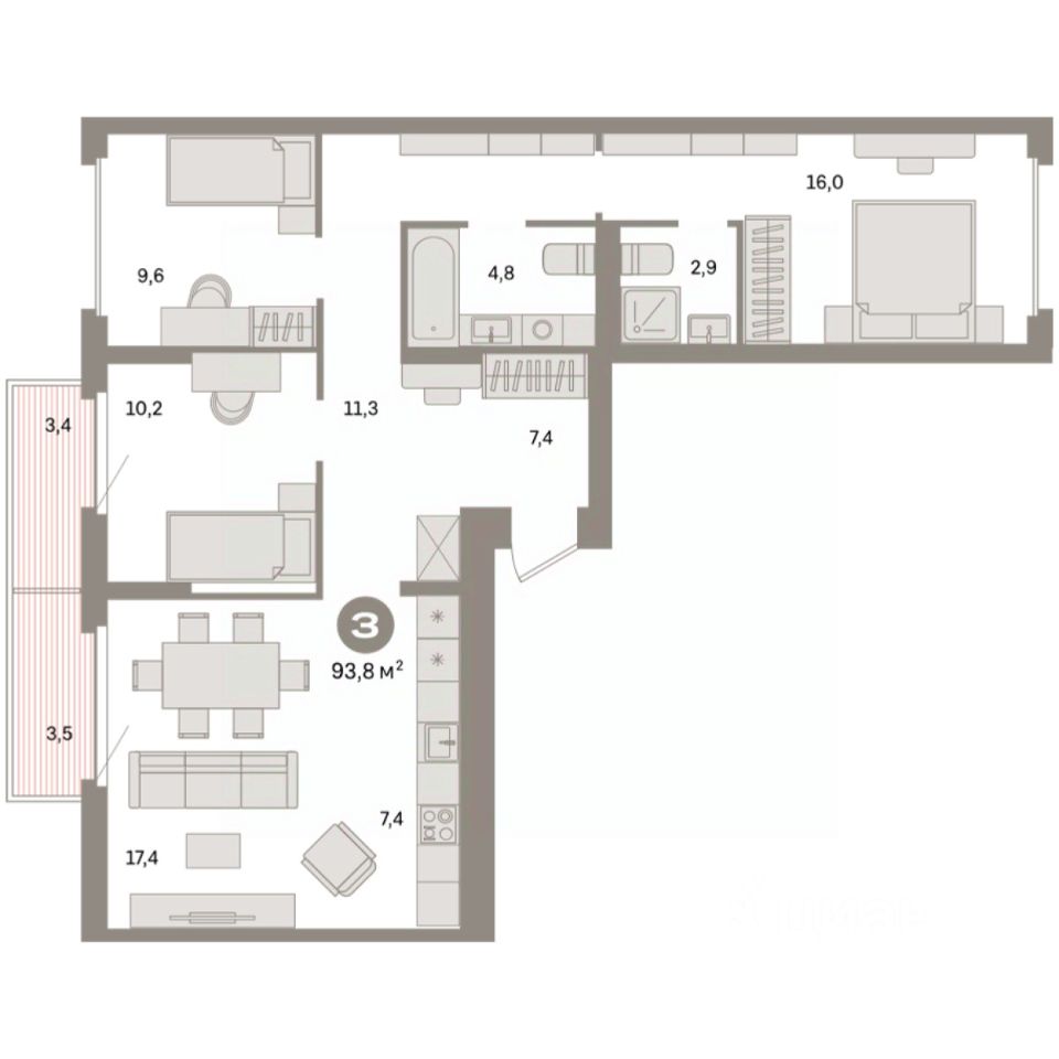Квартира с кухней-гостиной и тремя спальнями в квартале "Депо". Особенности планировки: окна на две стороны, вид во двор, разнесённые спальни, предчистовая отделка, мастер-спальня, балкон.