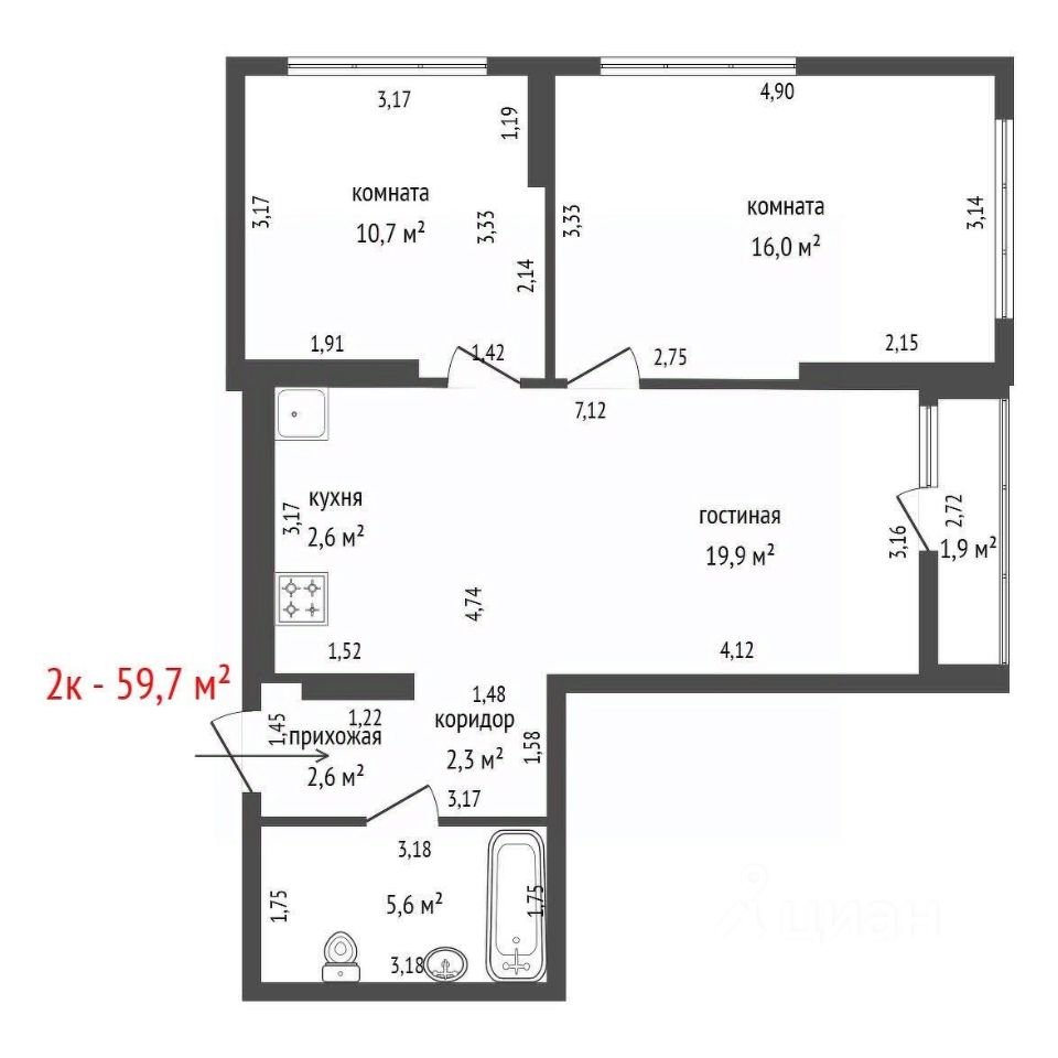 - Общая площадь 59,7 м²