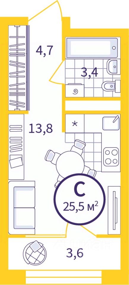 1-комн. квартира-студия в ЖК "Астон.Сезоны" на 18 этаже. Квартира без отделки, после получения ключей можно делать ремонт. Общая площадь: 23.67 кв.м., площадь гостиной 13.8 кв.м., из которых 5 кв.м. выделено под кухонную зону. Все окна выходят на одну сторону. В квартире одна лоджия, один совмещенный санузел. Высота потолков 2.7 м.