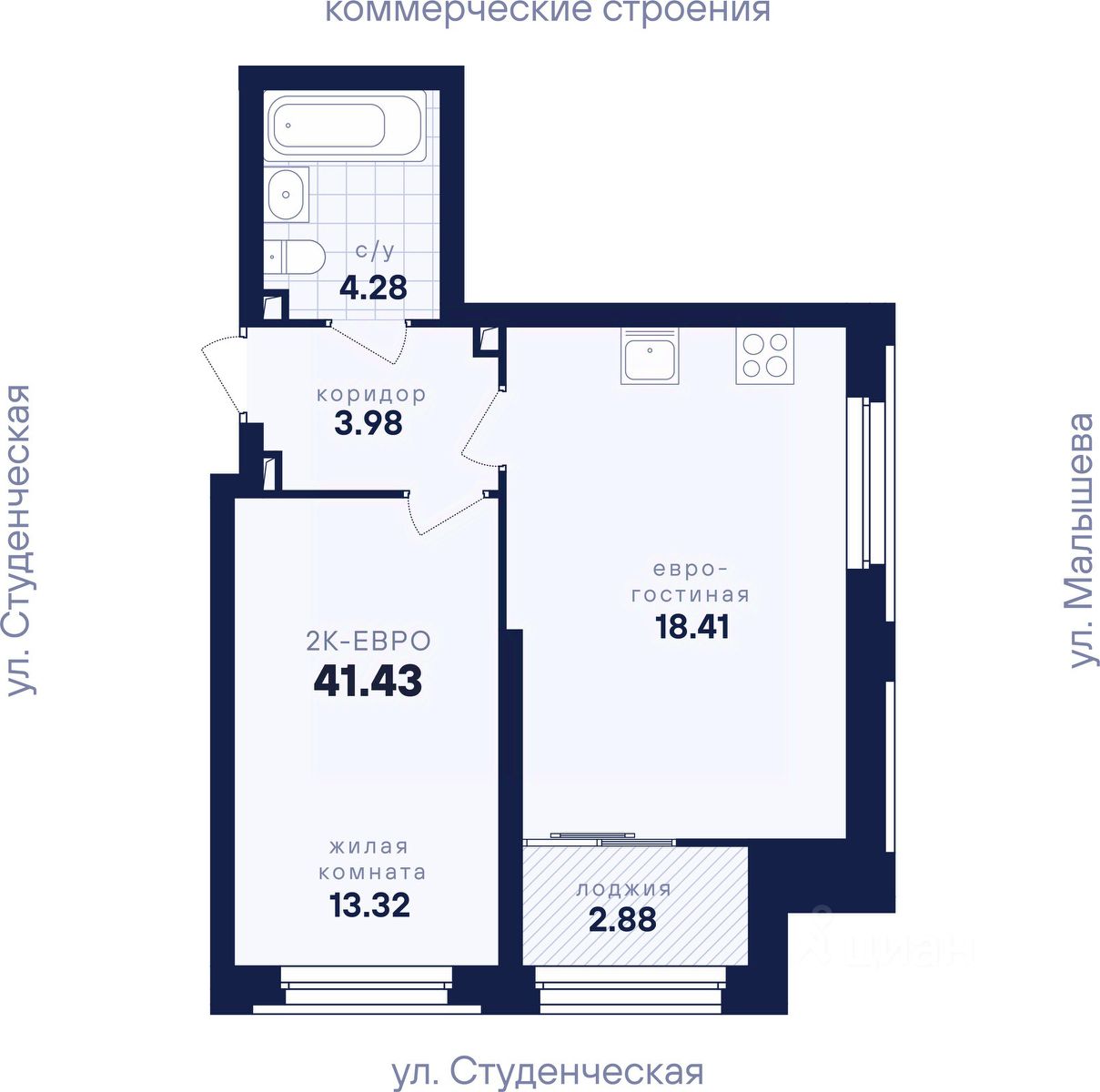 Общая площадь41,43 м²