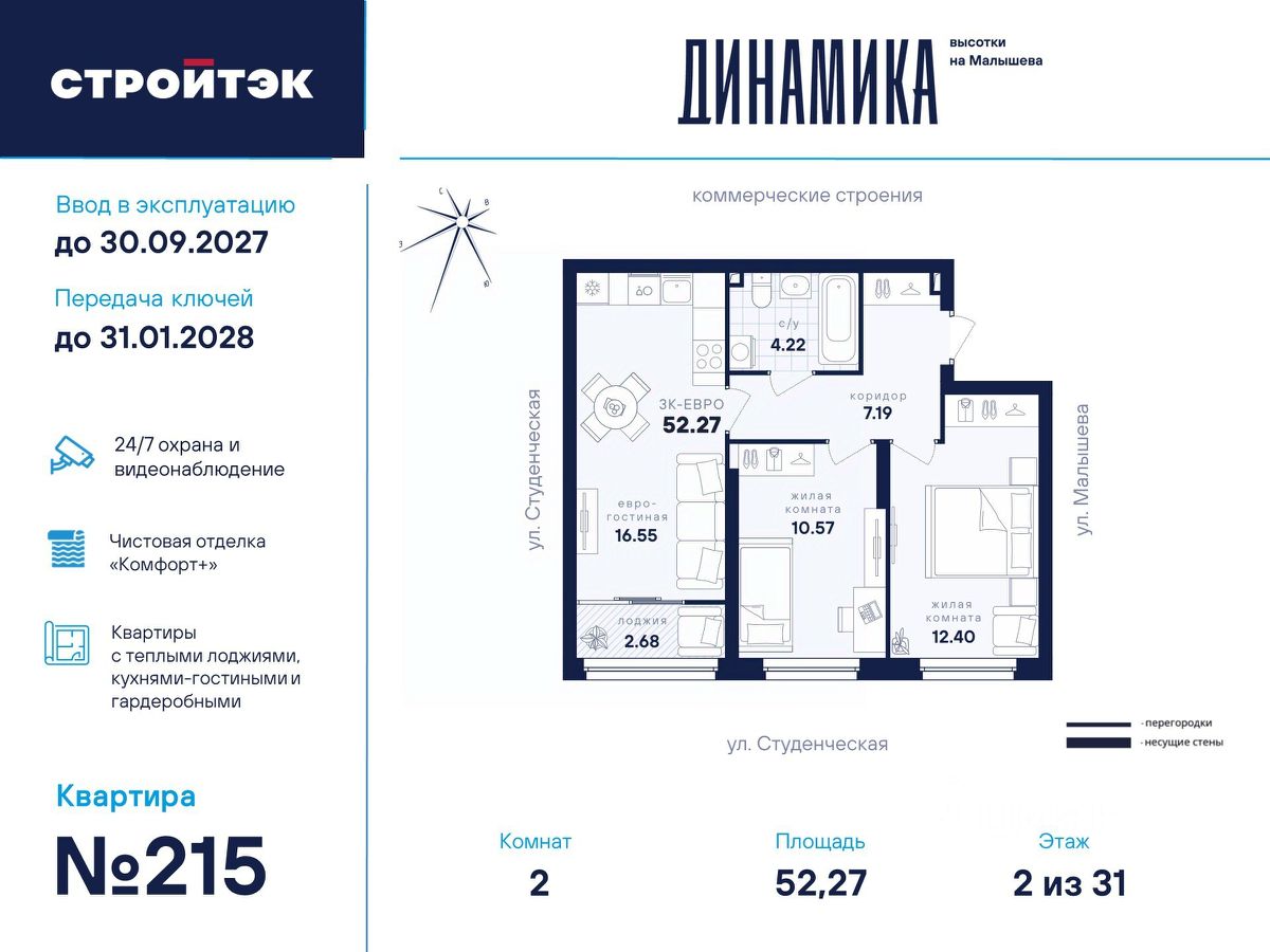 Настройте жизнь на максимум В Динамике воплощают мечты. Её фасады стремятся ввысь и рисуют силуэт ступеней — символа вашего движения, где всё задуманное сбывается. В интеллигентном микрорайоне Втузгородок всё под рукой. Пешком до остановки 5 минут, на машине до центра — 10. Соседство с торговыми комплексами и доступность ЕКАД входят в число преимуществ квартала наравне с близостью УРФУ, главных театров, филармонии, школ и детсадов. Выгляните в окно — и увидите знаменитое озеро Шарташ, которому около миллиона лет. Здесь катаются на сапах, лодках и катамаранах, а в Шарташском лесопарке вокруг озера — на велосипедах летом и лыжах зимой. Новое звучание района Выразительные башни Динамики притягивают взгляды издалека. Сплошные стеклянные витражи фасадов меняют восприятие проекта в зависимости от ракурса, времени года и суток. В квартирах с витражным остеклением алюминиевые оконные рамы и широкие подоконники визуально увеличивают пространство. Благодаря современным технологиям витражи обеспечивают дополнительную теплоизоляцию, помогая сохранять комфортный микроклимат в квартире и летом, и зимой. Отдых в вашем ритме Выбирайте досуг по душе для себя и семьи. Занимайтесь на тренажёрах и воркаут-комплексе, играйте в пинг-понг, футбол или баскетбол. А детей предоставьте насыщенному плейхабу, который тренирует тактильность и равновесие в атмосфере безопасности и контролируемого риска. Размеренно прогуливайтесь меж декоративных холмов, под тенистыми навесами-перголами вблизи удобных скамеек, многолетних трав и разновысотной уличной мебели. СТРОЙТЭК возводит Динамику в 3 этапа. Второй этап строительства В нём 2 секции. С2 — престижная высотка в 31 этаж. Здесь 209 квартир от 1- до 3-комнатных и 19 уникальных планировок с просторными кухнями-гостиными до 21 м квадратного. Кроме того, закрытый паркинг на 31 место и 40 кладовых-келлеров внутри стилобата. В подъезде С2 — светлый холл с минималистичным дизайном бизнес-класса, помещения для колясок и самокатов, а также 3 надёжных лифта на 1 000 кг каждый. С4 — парадный 6-этажный дом с элегантной смещённой геометрией и полным витражным остеклением всех 5 жилых этажей. Внизу расположено впечатляющее лобби с лаунж-зоной и стойкой ресепшен, атмосферная уличная площадь для встреч и торговая галерея. В секции всего 34 квартиры в 16 уникальных планировках от студий до 3-комнатных. Это особый уровень респектабельной и неторопливой жизни. Технологии комфорта Обратите внимание на специальные форматы планировок с гардеробными и тёплыми лоджиями. Отдельно в С4 — на видовые квартиры с террасами на 5 и 6 этажах, а также лоты с мастер-спальнями, где у приватного пространства для отдыха своя ванная. Что касается отделки — в Динамике улучшенный стандарт "Комфорт+". Помимо привычных комфортных сантехники и электрики, в него входят оконные стёкла Energy Light, приточные клапаны вентиляции Air-Box, особо прочный ламинат 33 класса и устойчивые к многократной покраске виниловые обои. Белые межкомнатные двери и плинтусы лаконично подчеркну