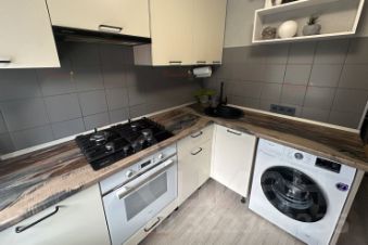 При продаже остается кухонный гарнитур с сварочной поверхностью, духовым шкафом и стиральной машиной, а так же очень вместительный шкаф в гостиной.