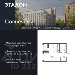 Продается квартира 33, по адресу Свердловская обл., г. Екатеринбург, Чкаловский район, корпус Солнечный, блок 5.4, корпус 1 в Солнечный на 7 этаже, с площадью 27.5 м2.