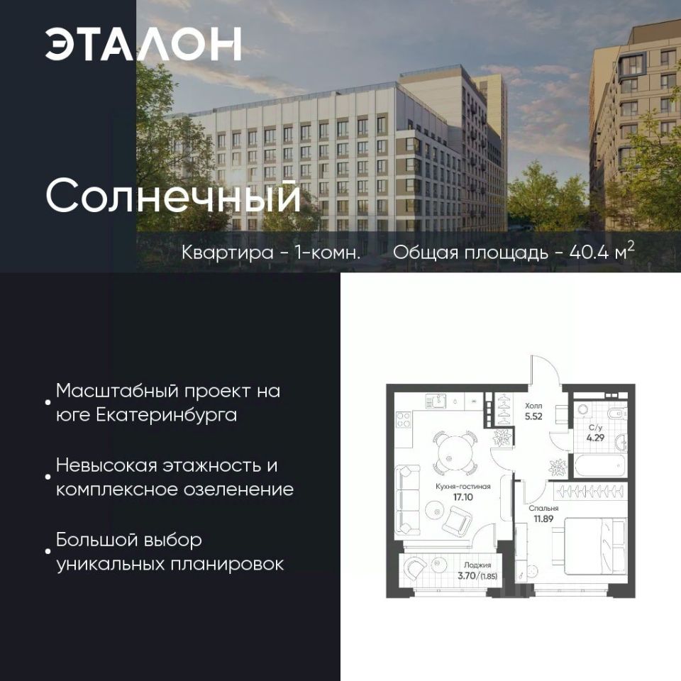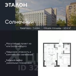 Продается квартира 321, по адресу Свердловская обл., г. Екатеринбург, Чкаловский район, корпус Солнечный, корпус 5.3 в Солнечный на 3 этаже, с площадью 40.4 м2.