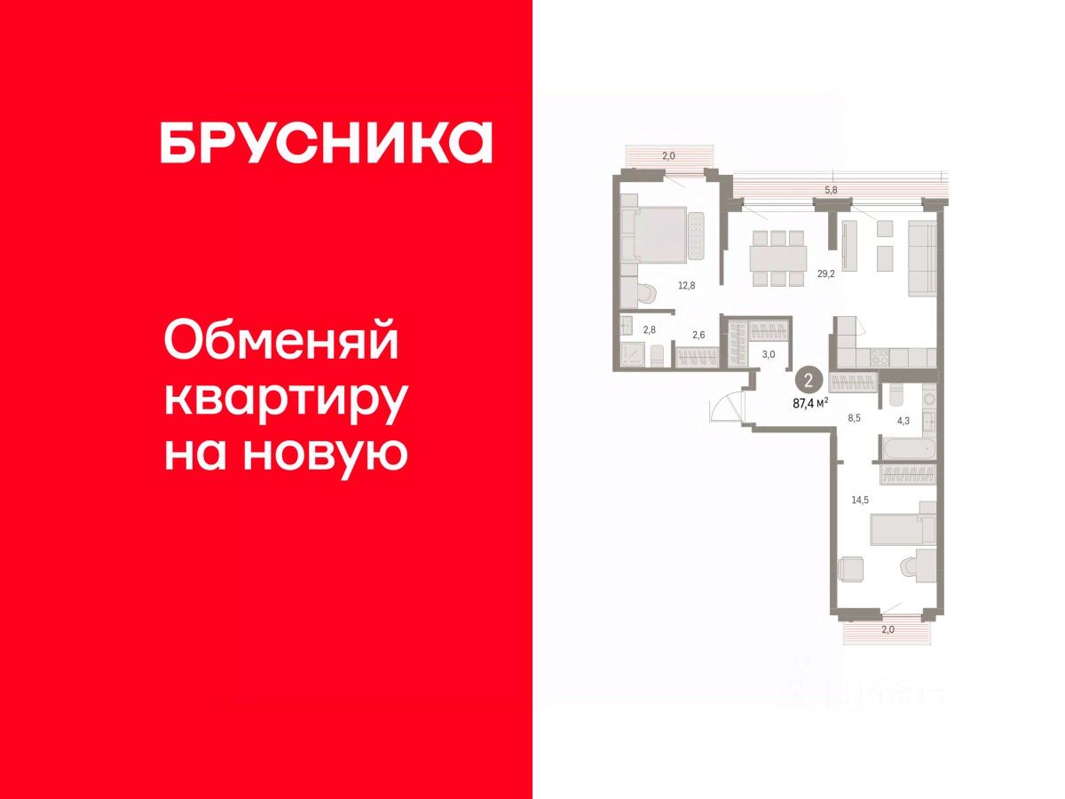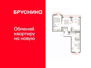 Квартира с кухней-гостиной и двумя спальнями в Бруснике в Академическом. Особенности планировки: балкон, вид во двор, гардеробная, мастер-спальня, окна на две стороны, предчистовая отделка, разнесённые спальни, терраса на крыше.