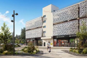 Детский сад в центре комплекса и большой наземный паркинг с торговой галереей поблизости.