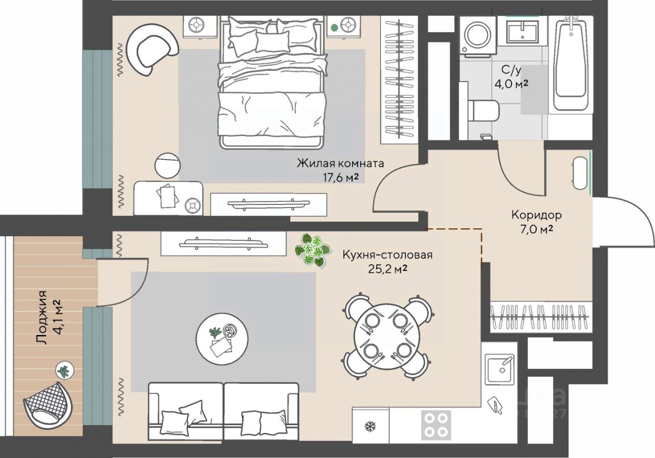 Продаётся 1-комнатная квартира в строящемся доме (Дом 1 этап 1.1), срок сдачи: I-кв. 2028, общей площадью 55.9 кв.м., на 9 этаже.