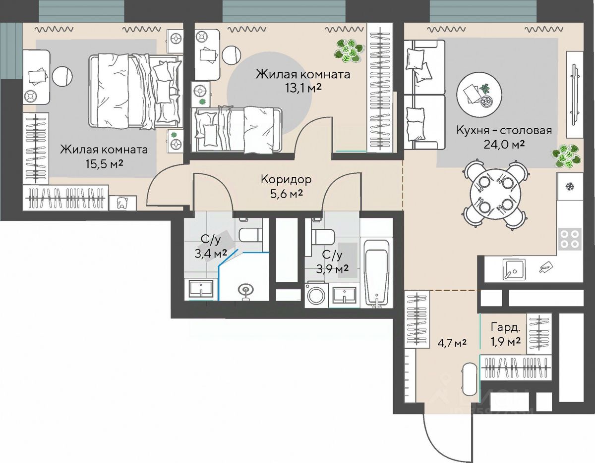 Продаётся 2-комнатная квартира в строящемся доме (Дом 1 этап 1.1), срок сдачи: I-кв. 2028, общей площадью 72.1 кв.м., на 15 этаже.