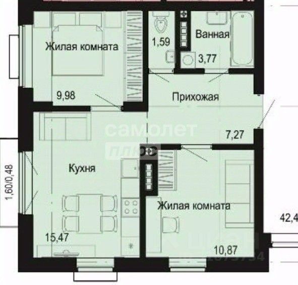 Арт. 118596330 В продаже 2-комнатная квартира 49,43 м2 в комплексе "Центральный парк" комфорт-класса.