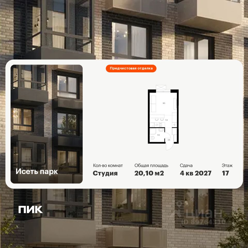 Продаётся квартира-студия площадью 20,1 кв.м на 17 этаже 24 этажного дома (Корпус 5, Секция 1) проекта ПИК Исеть парк. Светлый просторный подъезд на уровне земли, функциональная планировка, большие окна, предчистовая отделка.