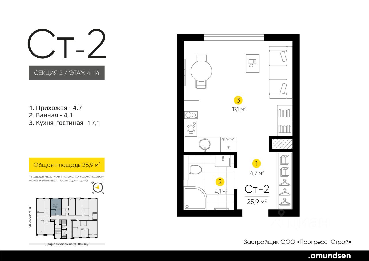 Жилой квартал "Amundsen" - для себя, для семьи, для жизни и развития. Авторская концепция проекта эффектно выделяется в 3 особенностях комплекса: фасады, двор и места общего пользования. AMUNDSEN ПРОЕКТ С ХАРАКТЕРОМ ВЕЛИКОГО ПЕРВООТКРЫВАТЕЛЯ. 4 СЕЗОНА: Двор-трансформер позволяет активно использовать все площадки круглый год. В холодное время года санки, коньки и снежные бои за главную башню. В теплое время источник наполняет двор водой и прохладой. Работают площадки для активных игр и спокойного отдыха. 6 ДЕТСКИХ ПЛОЩАДОК: Мы разделили площадки по возрастным группам для малышей и детей постарше. Качели, аттракционы, водные и активные игры созданы, чтобы познавать мир. 5 ПЛОЩАДОК ДЛЯ СПОКОЙНОГО ОТДЫХА: За счет игры с ландшафтом мы создали приватные зоны, украсили пространство разнотравьем, оживили двор источником. Шум воды, лежаки, беседки, парк места, где ты почувствуешь течение жизни. AMUNDSEN ИДЕАЛЬНОЕ МЕСТО ДЛЯ ЖИЗНИ И РАЗВИТИЯ. - Жилой квартал расположен в экологически чистом районе в окружении двух лесных массивов. - Новые современные школы и детские сады. Спортивный кластер для занятий. - Главный холл пространство для всех. Для самых маленьких игры, для взрослых кафе с ярким дизайном, тихий коворкинг, места для отдыха и светлый, просторный атриум. - Детские площадки "будущего" с оригинальным подходом к созданию игровой среды. - Безопасная территория. Круглосуточная охрана, видеонаблюдение 24/7, электронная система доступа, двор без машин. Застройщик ООО СЗ "Прогресс-Строй", проектная декларация на сайте наш.дом.рф