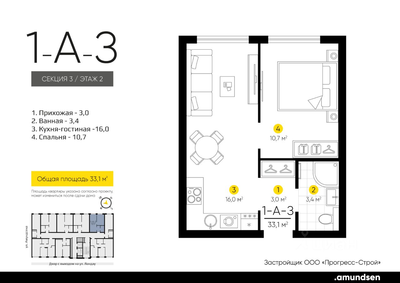 Жилой квартал "Amundsen" - для себя, для семьи, для жизни и развития. Авторская концепция проекта эффектно выделяется в 3 особенностях комплекса: фасады, двор и места общего пользования. AMUNDSEN ПРОЕКТ С ХАРАКТЕРОМ ВЕЛИКОГО ПЕРВООТКРЫВАТЕЛЯ. 4 СЕЗОНА: Двор-трансформер позволяет активно использовать все площадки круглый год. В холодное время года санки, коньки и снежные бои за главную башню. В теплое время источник наполняет двор водой и прохладой. Работают площадки для активных игр и спокойного отдыха. 6 ДЕТСКИХ ПЛОЩАДОК: Мы разделили площадки по возрастным группам для малышей и детей постарше. Качели, аттракционы, водные и активные игры созданы, чтобы познавать мир. 5 ПЛОЩАДОК ДЛЯ СПОКОЙНОГО ОТДЫХА: За счет игры с ландшафтом мы создали приватные зоны, украсили пространство разнотравьем, оживили двор источником. Шум воды, лежаки, беседки, парк места, где ты почувствуешь течение жизни. AMUNDSEN ИДЕАЛЬНОЕ МЕСТО ДЛЯ ЖИЗНИ И РАЗВИТИЯ. - Жилой квартал расположен в экологически чистом районе в окружении двух лесных массивов. - Новые современные школы и детские сады. Спортивный кластер для занятий. - Главный холл пространство для всех. Для самых маленьких игры, для взрослых кафе с ярким дизайном, тихий коворкинг, места для отдыха и светлый, просторный атриум. - Детские площадки "будущего" с оригинальным подходом к созданию игровой среды. - Безопасная территория. Круглосуточная охрана, видеонаблюдение 24/7, электронная система доступа, двор без машин. Застройщик ООО СЗ "Прогресс-Строй", проектная декларация на сайте наш.дом.рф