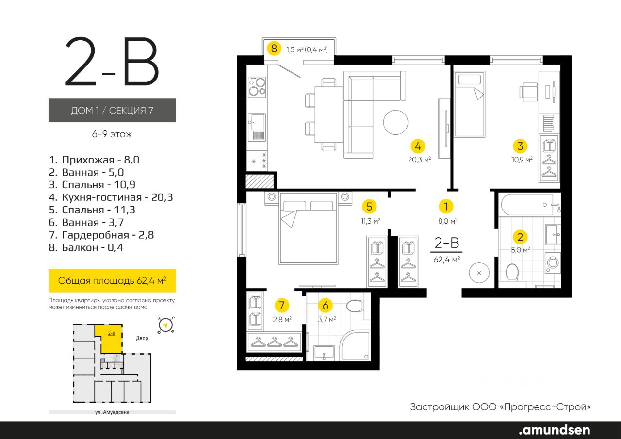 Жилой квартал "Amundsen" - для себя, для семьи, для жизни и развития. Авторская концепция проекта эффектно выделяется в 3 особенностях комплекса: фасады, двор и места общего пользования. AMUNDSEN ПРОЕКТ С ХАРАКТЕРОМ ВЕЛИКОГО ПЕРВООТКРЫВАТЕЛЯ. 4 СЕЗОНА: Двор-трансформер позволяет активно использовать все площадки круглый год. В холодное время года санки, коньки и снежные бои за главную башню. В теплое время источник наполняет двор водой и прохладой. Работают площадки для активных игр и спокойного отдыха. 6 ДЕТСКИХ ПЛОЩАДОК: Мы разделили площадки по возрастным группам для малышей и детей постарше. Качели, аттракционы, водные и активные игры созданы, чтобы познавать мир. 5 ПЛОЩАДОК ДЛЯ СПОКОЙНОГО ОТДЫХА: За счет игры с ландшафтом мы создали приватные зоны, украсили пространство разнотравьем, оживили двор источником. Шум воды, лежаки, беседки, парк места, где ты почувствуешь течение жизни. AMUNDSEN ИДЕАЛЬНОЕ МЕСТО ДЛЯ ЖИЗНИ И РАЗВИТИЯ. - Жилой квартал расположен в экологически чистом районе в окружении двух лесных массивов. - Новые современные школы и детские сады. Спортивный кластер для занятий. - Главный холл пространство для всех. Для самых маленьких игры, для взрослых кафе с ярким дизайном, тихий коворкинг, места для отдыха и светлый, просторный атриум. - Детские площадки "будущего" с оригинальным подходом к созданию игровой среды. - Безопасная территория. Круглосуточная охрана, видеонаблюдение 24/7, электронная система доступа, двор без машин. Застройщик ООО СЗ "Прогресс-Строй", проектная декларация на сайте наш.дом.рф